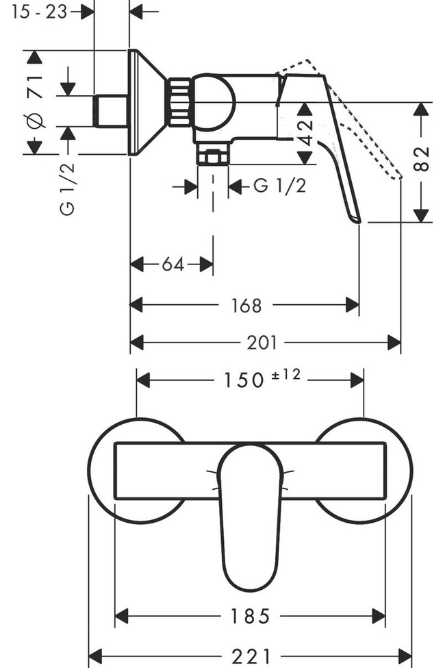 • razmak između dovoda cijevi tople i hladne vode: 150 mm ± 12 mm